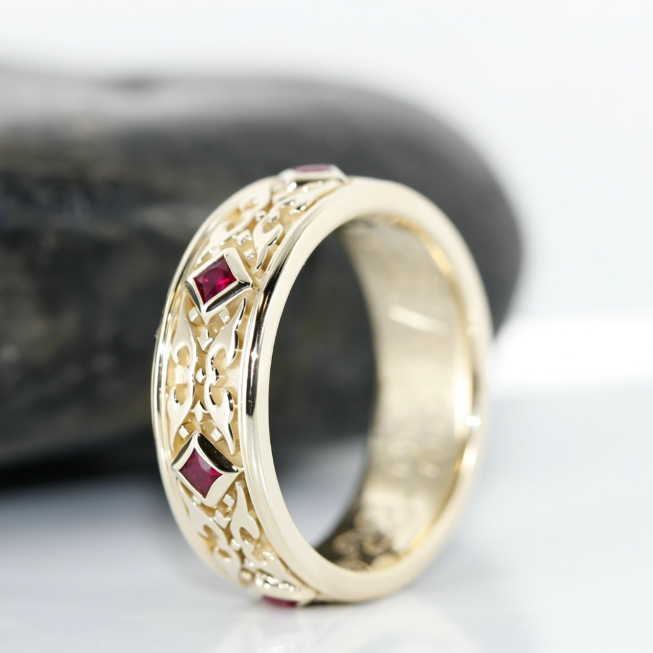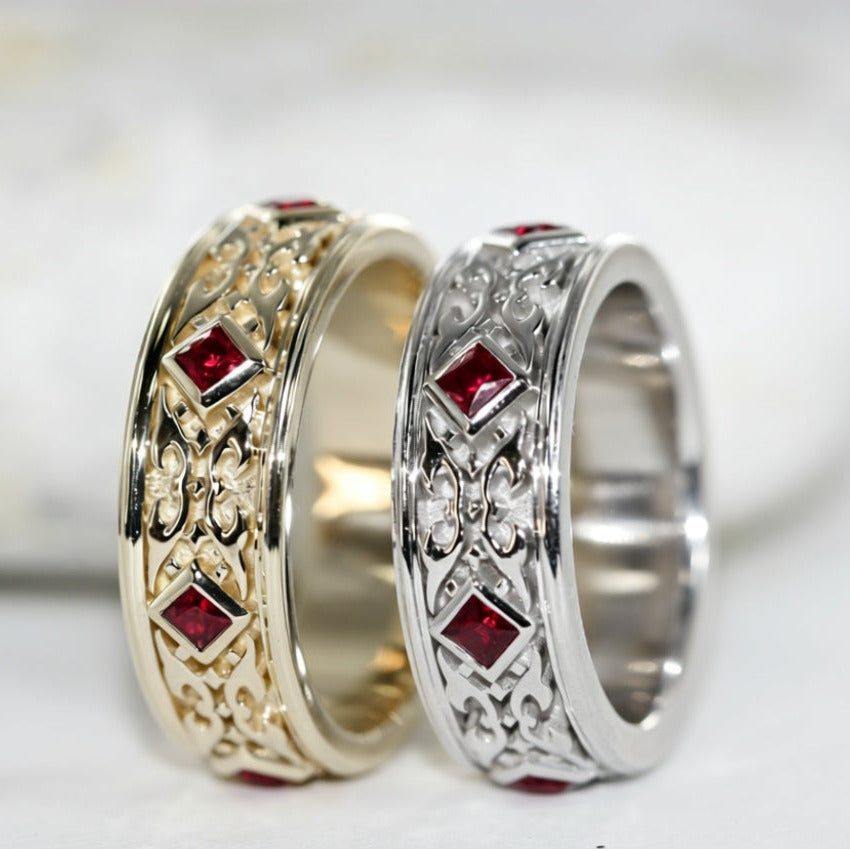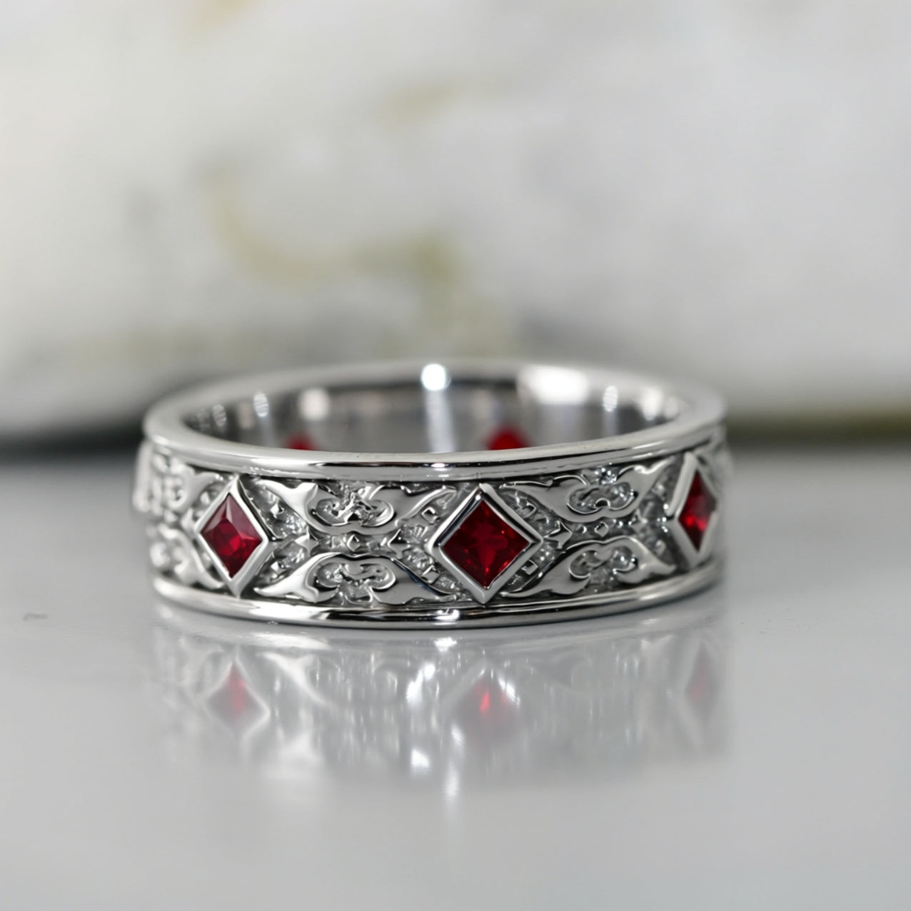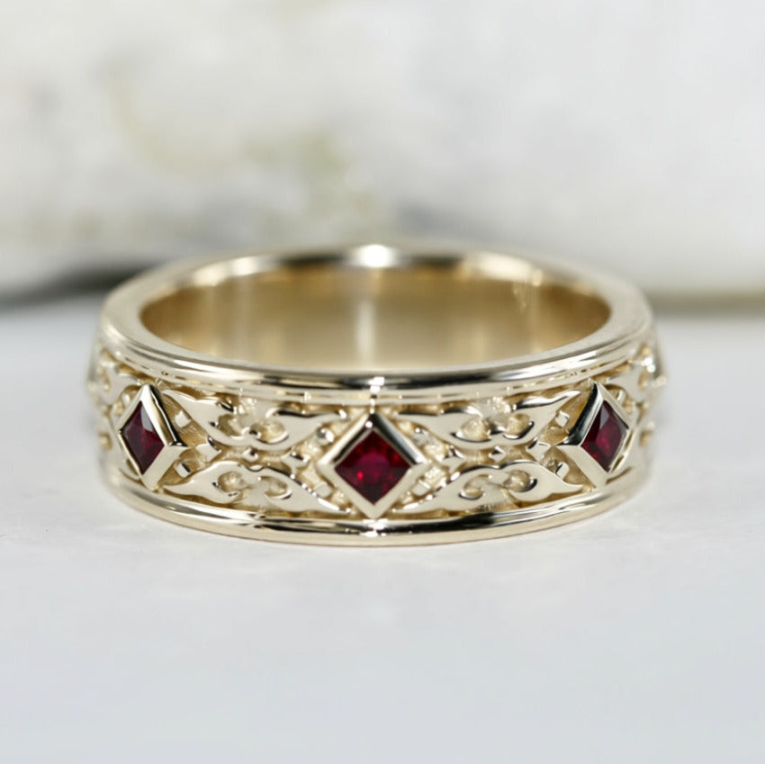 This striking men's Celtic wedding ring showcases a princess-cut natural ruby, elegantly set into a beautifully carved Celtic knot band. The intricate craftsmanship and bold design make it a perfect choice for men seeking a distinctive and memorable wedding or anniversary ring.