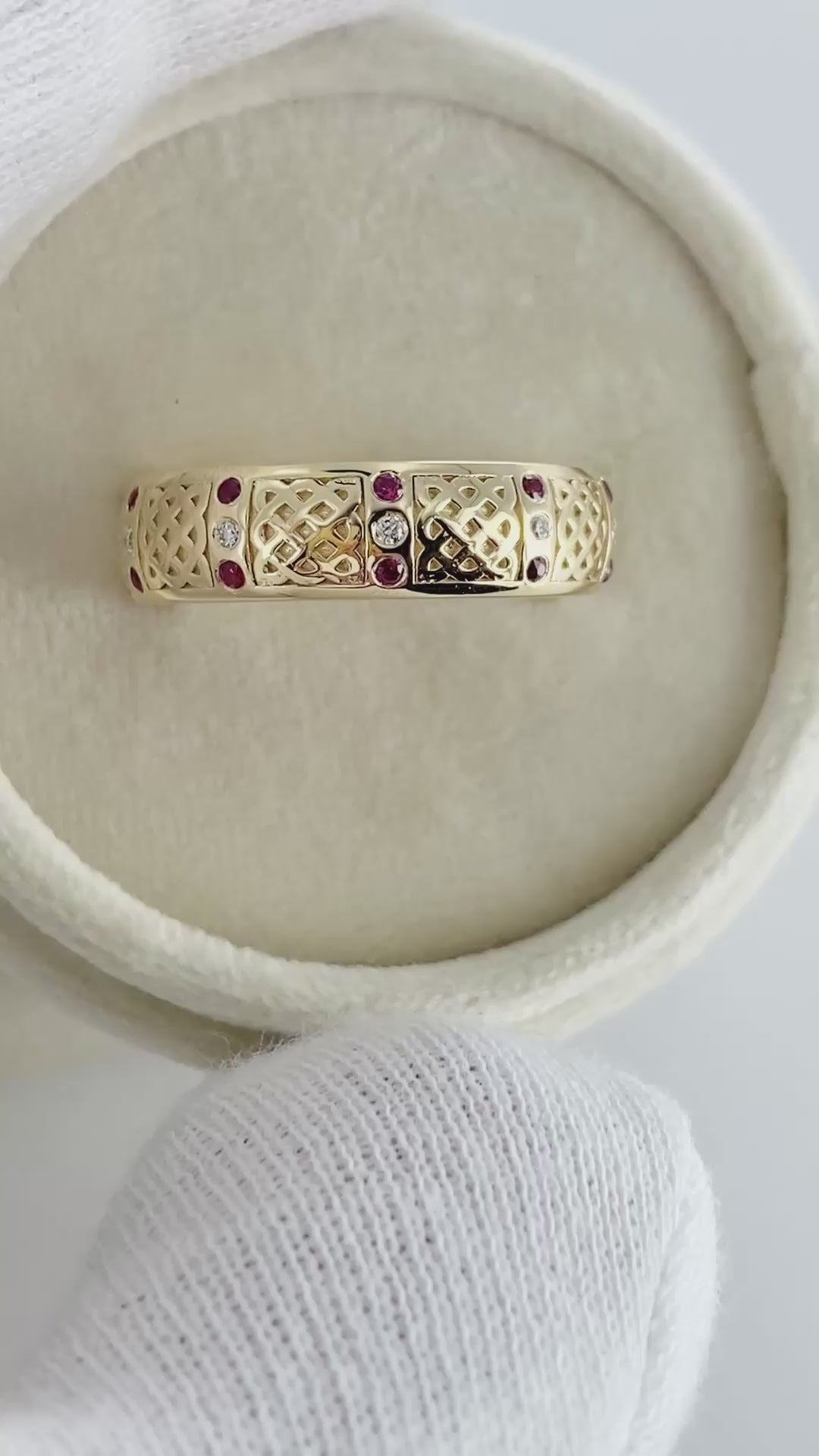 This ring combines the fiery elegance of rubies, the timeless sparkle of diamonds, and the rich symbolism of Celtic knots, all set in the warmth of yellow gold.