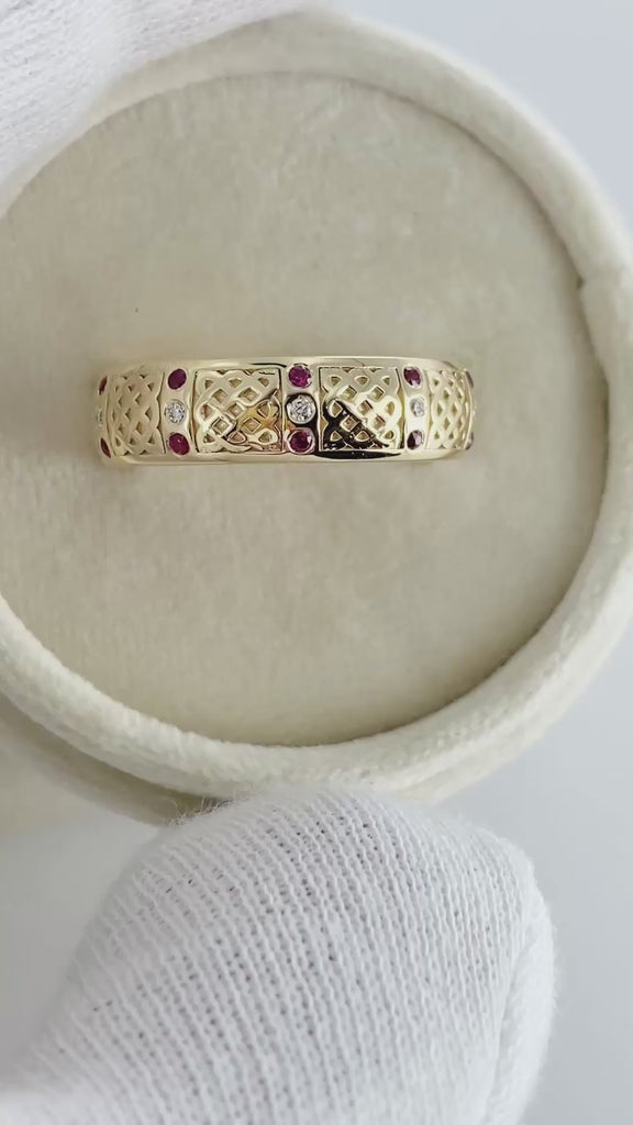 Ruby and Diamond Celtic Knot Wedding Ring in Yellow Gold