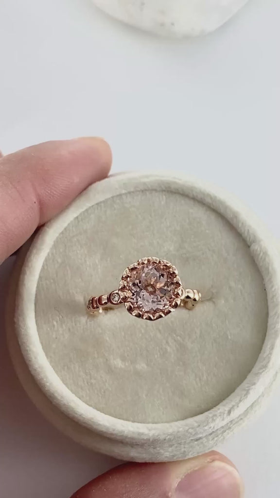 This hearty and elegant Morganite ring features 9mm round shaped natural Morganite. It is set into a gorgeous droplet basket setting on top of a diamond bezel pebble band. Absolutely gorgeous and yet unique gemstone to serve as your engagement or anniversary ring.