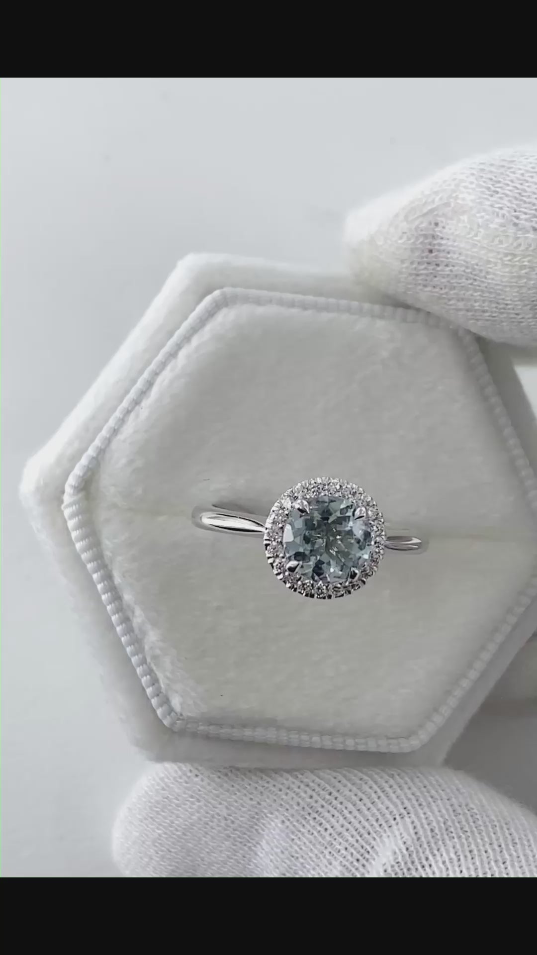 Beautiful round-cut aquamarine with stunning diamond accent! The center stone is a 7mm Round shaped aquamarine surrounded by sparkling conflict free diamond set in solid 14k white gold halo ring setting. A perfect piece to make any evening unforgettable.