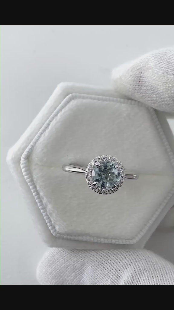 Blue Gemstone Aquamarine and Halo Diamond Engagement 14k White Gold Ring