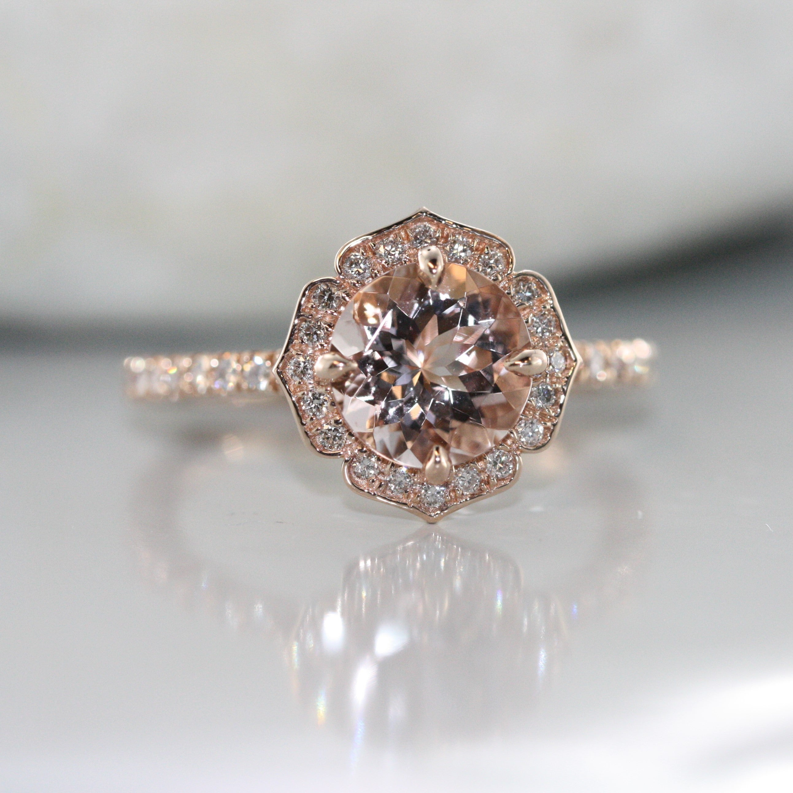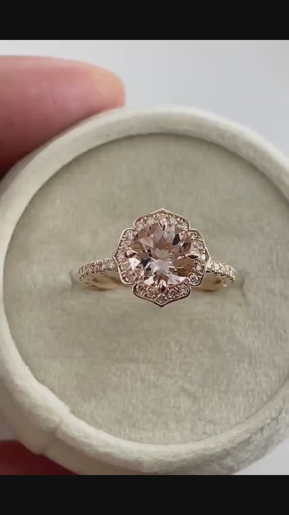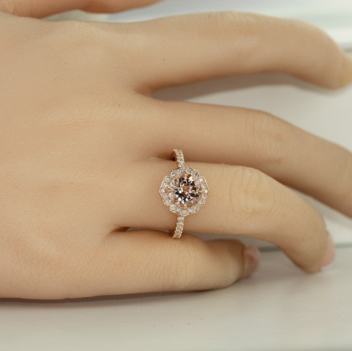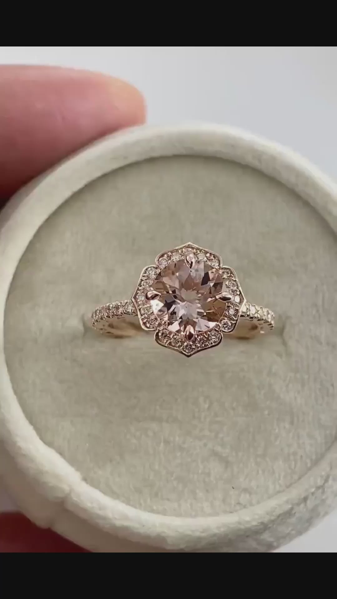 Brighten your day with a burst of beautiful color. This engagement ring consist a round cut 8 mm morganite in a gorgeous floral setting with diamonds on the band that illuminated the light of this ring. This ring is suitable for a variety of occasions, whether it is a proposal, engagement, anniversary or any other meaningful moment.
