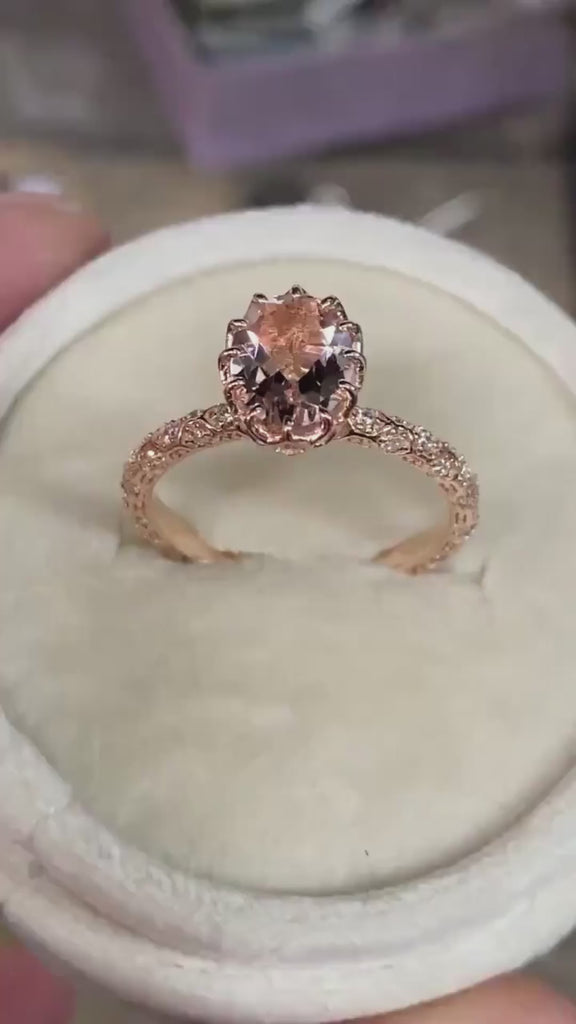 oval morganite set in a stunning 12-prong setting. The custom-made honeycomb design band is adorned with diamonds, adding radiant sparkle to the entire piece. The warm tones of rose gold complement Morganite color exceptionally well, creating a trendy and stylish combination.This ring is suitable for a variety of occasions, whether it is a proposal, engagement, anniversary or any other meaningful moment.