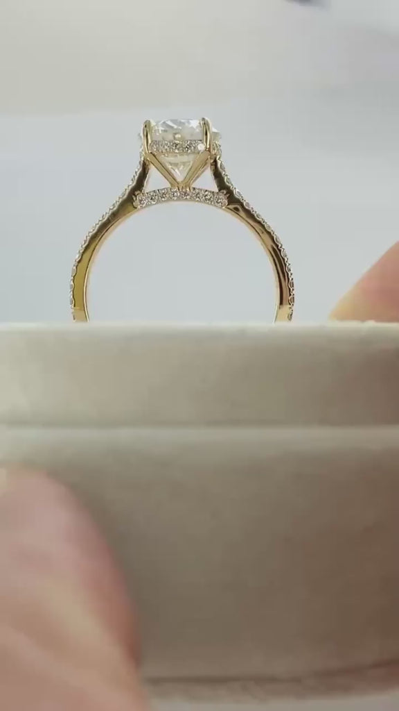 Oval Lab Grown Diamond and hidden halo diamond engagement ring in 14K solid yellow gold. Perfect ring crafted with meticulous attention to detail featuring a high quality grown diamond that captures the essence of your commitment. Whether you prefer a classic solitaire setting, halo design or vintage inspired piece, the perfect engagement ring is one that evokes emotion and brings joy every time it' sworn.
