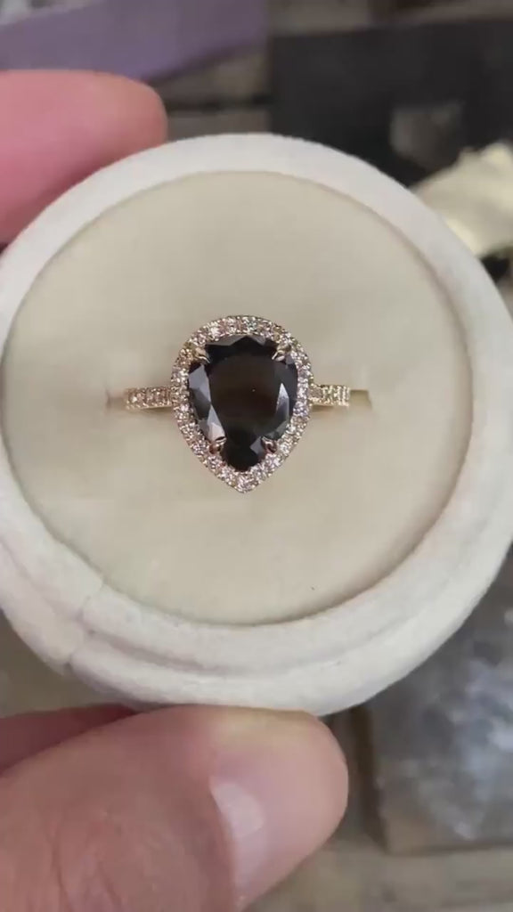 This ring is designed to perfectly showcase the center stone, featuring a specially cut natural pear-shaped black diamond surrounded by sparkling diamonds that adds a touch of uniqueness and elegance.