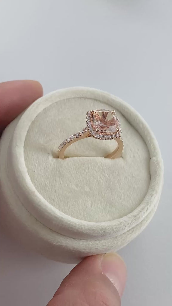 Balance is the key in designing a halo ring. We made this ring so perfectly balance and durable without sacrificing it's unique design. This Engagement ring features beautiful square-cut Morganite with stunning diamonds The center stone is a 8 mm square shaped morganite surrounded by sparkling conflict free diamond set in solid 14k rose gold halo ring setting.