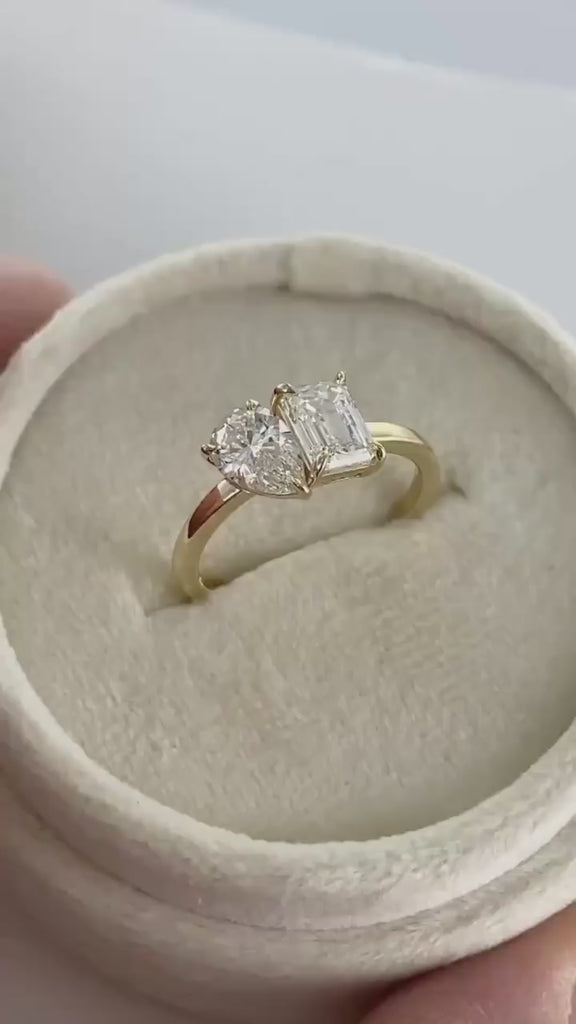 Two stone design brings together elegance and sophistication combining the classic Emerald cut with modern Pear -Teardrop cut, creates a perfect harmony between classic and modern aesthetics. Elevate your special moment with the Toi Et Moi Ring, where beauty, ethics, and everlasting love come together in a dazzling display.