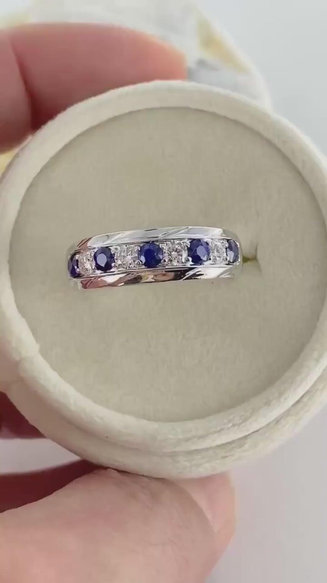 This stunning wedding ring features alternating sparkling round diamonds and blue sapphires set in a pave ring band. Its classic, timeless design makes it an ideal choice for a men's wedding band or anniversary ring, offering a heartfelt expression of love to cherished partners. The allure of blue sapphire lies not only in its beauty but also in its symbolism. Traditionally associated with qualities like wisdom, loyalty, and sincerity, it has been prized throughout history by royalty and nobility.