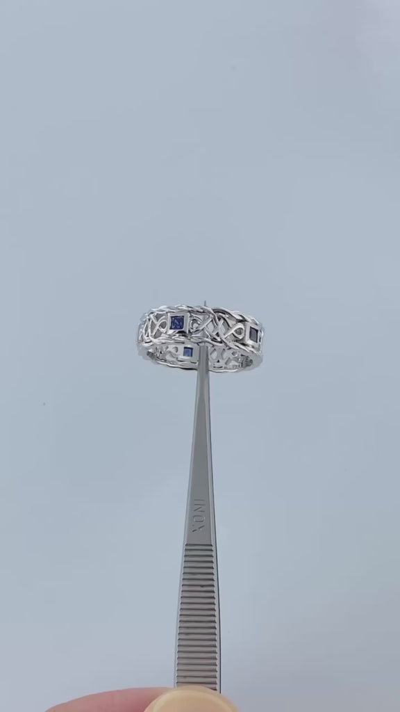 This stunning Celtic ring is a captivating piece of jewelry that combines the timeless beauty of blue sapphire with the intricate symbolism of the Celtic knot set in modern and sleek white gold provides a contemporary look, allowing the blue sapphire to stand out. Whether chosen for an engagement, wedding, or special occasion, this ring is a timeless treasure that will be cherished for generation