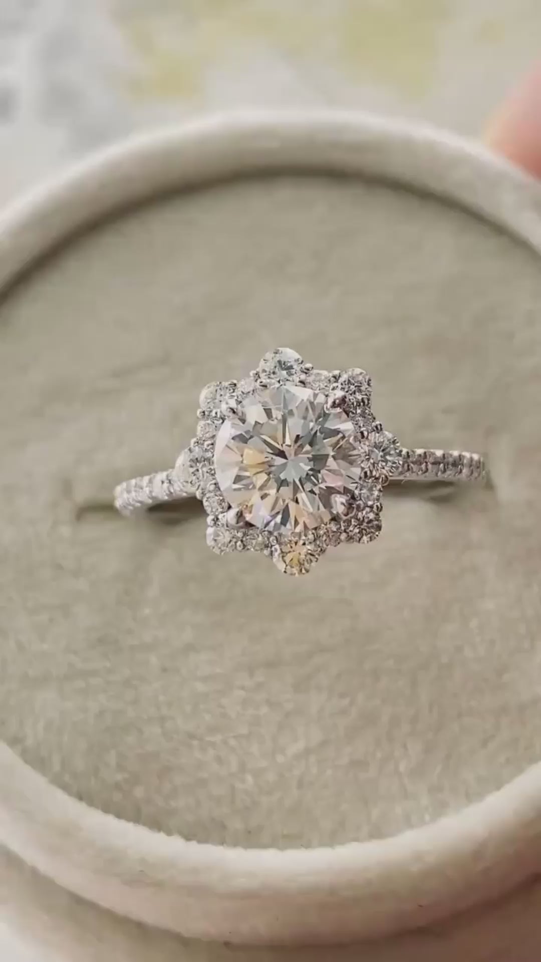 This engagement ring showcases a delicate, floral-inspired design that symbolizes beauty and new beginnings. The center stone is elegantly surrounded by diamonds of varying sizes, creating a charming and sophisticated look. Crafted in 14k solid gold, it features small diamonds along the sides of the shank, adding a romantic and aesthetic touch.