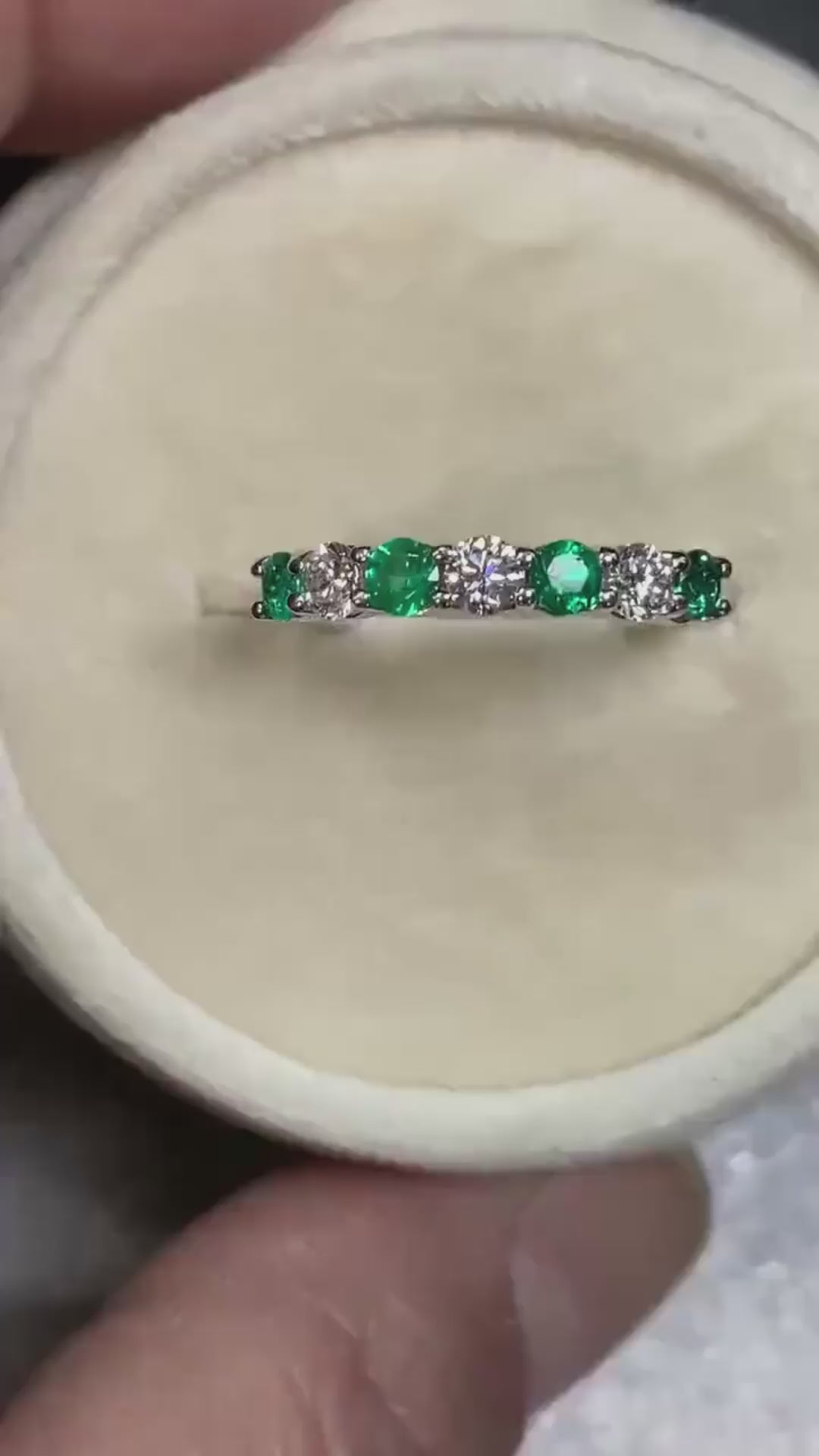 This exquisite 7-stone ring showcases a stunning combination of round brilliant-cut diamonds and vibrant green emeralds, set in a sleek and elegant band. The alternating gemstones create a captivating contrast, enhancing the brilliance of the diamonds and the rich hue of the emeralds.