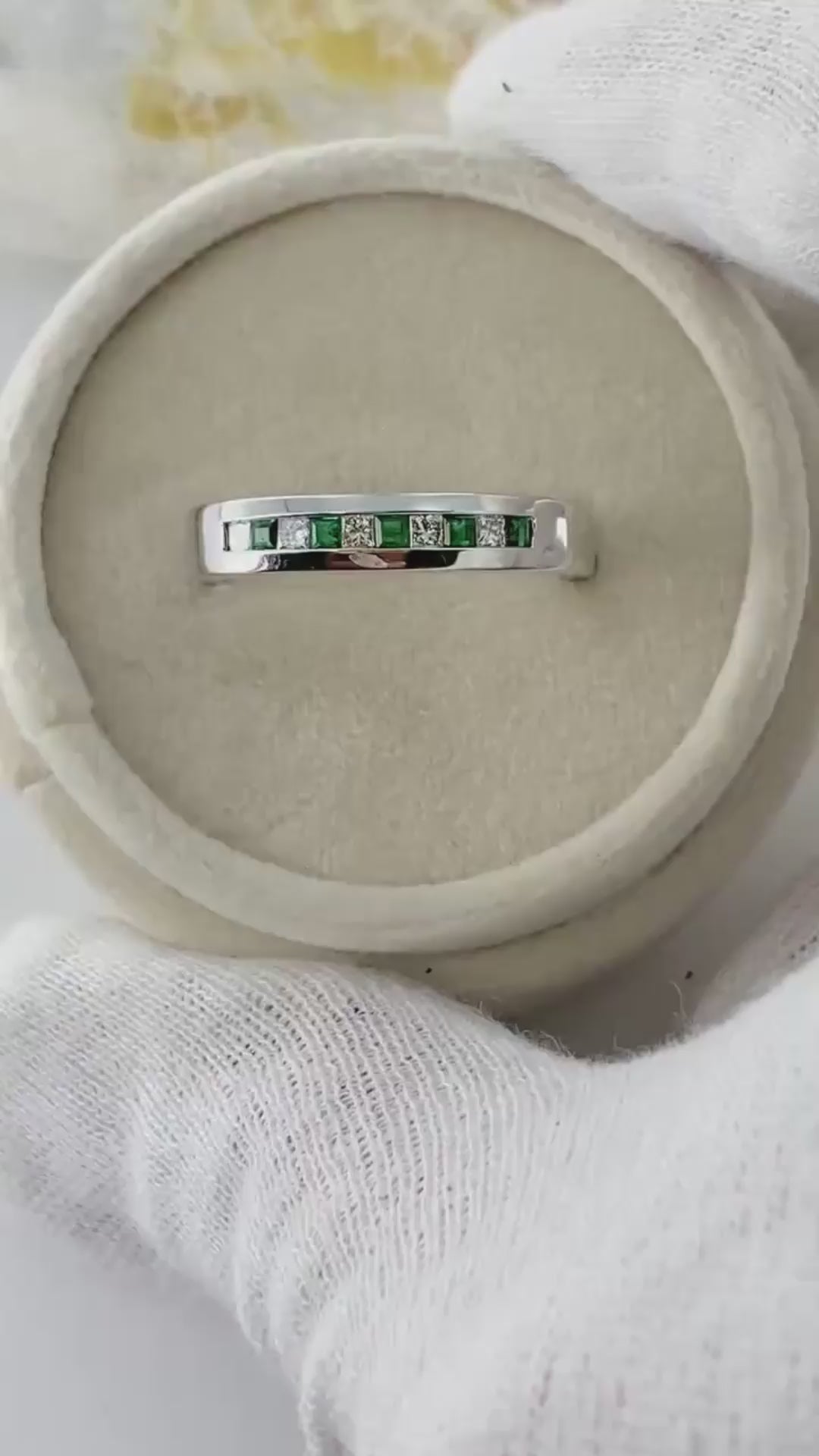 This elegant wedding ring features sparkling princess-cut diamonds alternating with emerald, all set in a channel-set ring band. With its gorgeous and chic design, this ring is the perfect choice for a wedding or anniversary ring for women.