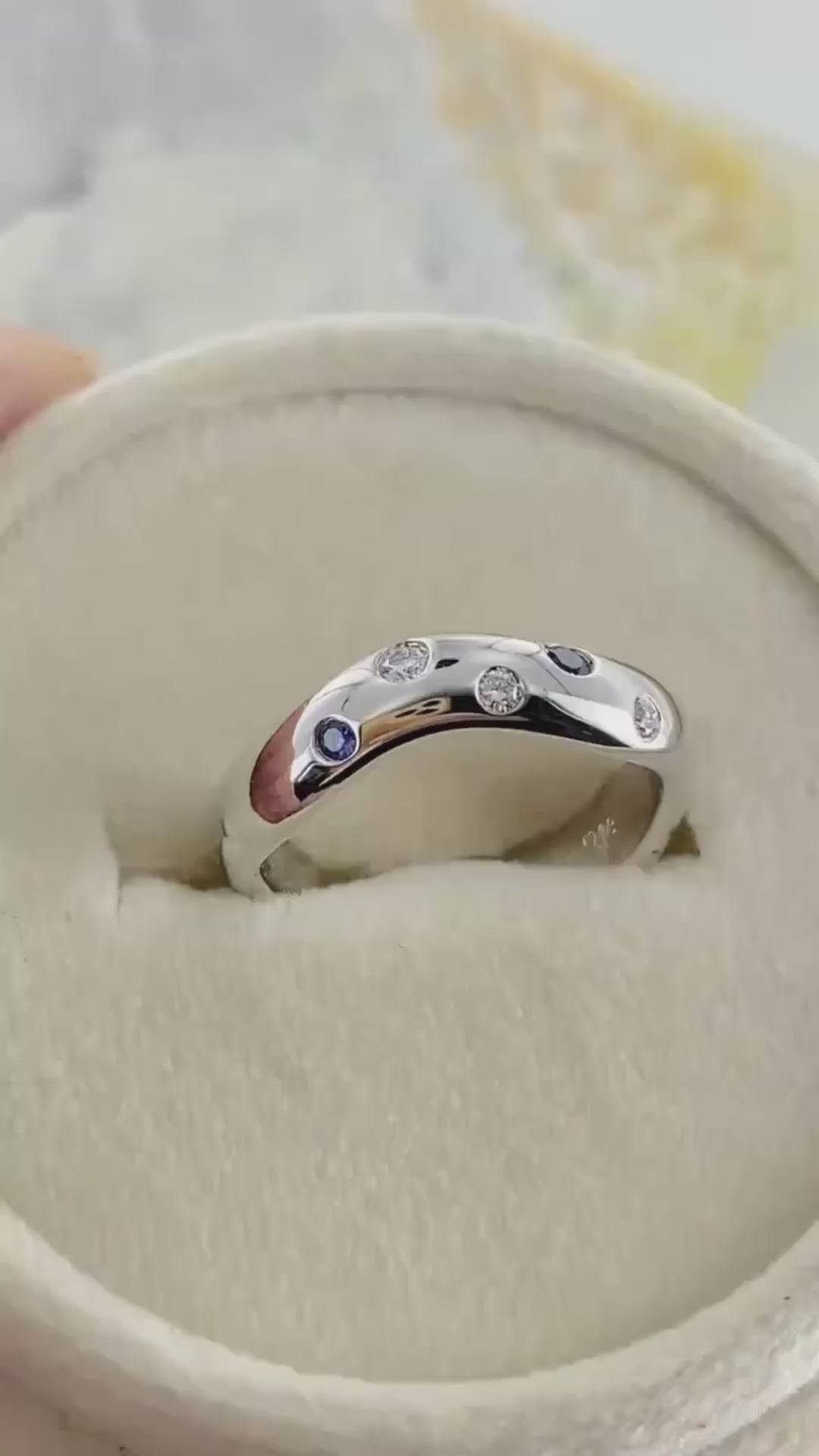 This curved wedding band has a smattering of diamonds and blue sapphires set in a ring band adding a dazzling sparkle. This ring is both unique and fabulous as an anniversary ring or wedding ring for men and women.