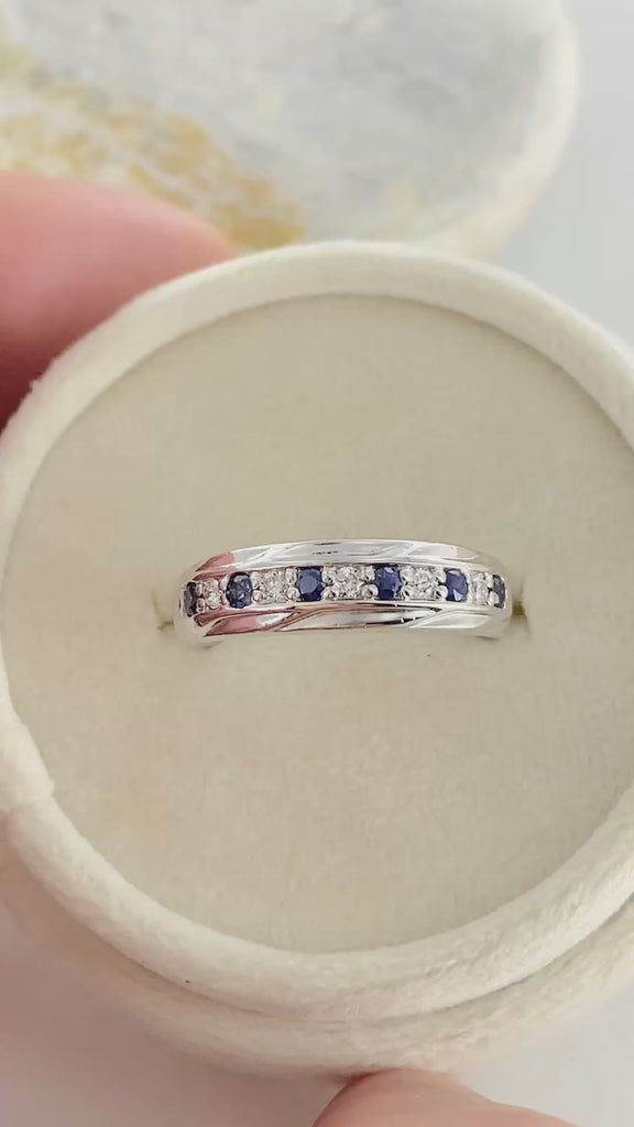 This stunning wedding ring features alternating sparkling round diamonds and blue sapphires set in a pave ring band. Its classic, timeless design makes it an ideal choice for a men's wedding band or anniversary ring, offering a heartfelt expression of love to cherished partners.